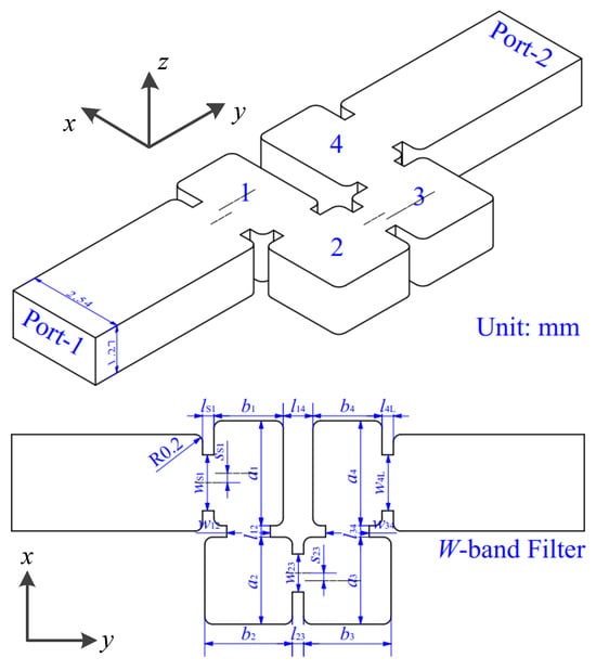 As shown in Figure 7, this geometric configuration of the W-band filter comprises two standard WR-10 waveguides (a × b = 2.54 mm × 1.27 mm), two cavities with ratio = 1.38 (Resonator-1 and Resonator-4) and two resonators with ratio = 1.58 (Resonator-2 and Resonator-3). Obviously, the first strategy is employing four resonators with different ratios to stagger the high-order harmonics to destroy the spurious passbands. The second strategy is using the folded structure to form the orthogonal couplings to decrease the unwanted TE102 nor TE201-mode responses and meanwhile obtain a compact structure, as revealed in Figure 7. The adjacent resonators, namely Resonator-1 and -2, Resonator-2 and -3 and Resonator-3 and -4, are directly magnetic couplings, which are implemented by the classical H-plane irises. It should be noted that there are no cross-couplings in this filter; as a result, a typical Chebyshev response will be obtained []. The third strategy is shifting certain couplings to compensate coupling orthogonality to completely eliminate the spurious passbands from the f0 to 2f0 band. In this design, the couplings between the input waveguide and Resonator-1, Resonator-2 and 3, as well as Resonator-4 and the output waveguide are shifted, as indicated in Figure 7. All the vertical corners have been filleted with a 0.2 mm radius (R), which is necessary for such a high-frequency filter considering the non-negligible drill size, as shown in Figure 7. Therefore, the previously discussed methods including the harmonics-staggered technique and orthogonal coupling method have been incorporated into this waveguide filter design without increasing the complexity and difficulty of the structure.