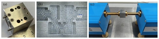 After a fine-tuning optimization procedure in ANSYS HFSS, the final dimensions of the proposed W-band waveguide filter are tabulated in Table 2. The proposed W-band waveguide filter was fabricated in an aluminum (Al) block based on the H-plane split method by the CNC-milling technology, as shown in Figure 8. The whole filter structure was machined within one block to avoid the problems of misalignment and high aspect ratio. The minimum radius of drills during the milling process is 0.2 mm, which has been taken into account in the simulation. The assembled Al block has a volume of W × L × H = 20 × 20 × 20 mm3, as shown in Figure 8a. Figure 8b gives the top view microphotograph of the internal structure, where it can be seen that both the fineness and flatness are achieved to guarantee a good electrical contact.