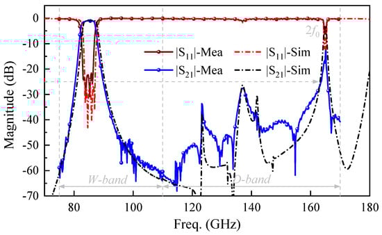 The tested and simulated S-parameter results of this W-band filter are compared in Figure 9. Very good agreement between the simulations and measurements including the passband and stopband performance is observed. It can be seen from the measured results that this practical filter can provide excellent spurious suppression with −25 dB up to 2f0. The original parasitic bands that resulted from harmonic modes between f0 and 2f0 have been completely eliminated. Consequently, this filter exhibits outstanding stopband performance without introducing additional resonators, structures or losses.