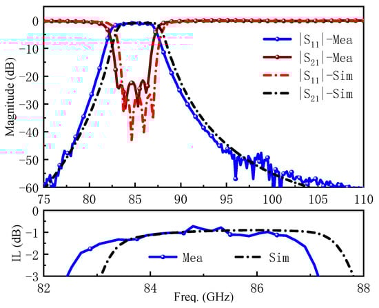 In addition, as can be seen in the detailed performance in the 75–100 GHz band in Figure 10, the basically symmetrical Chebyshev response has been achieved. The simulated 3 dB FBW is about 5.5% from 83.1 to 87.8 GHz, whereas the measured 3 dB FBW is about 5.5% from 82.5 to 87.2 GHz. They are matched well with the exception of a small band shift of about 0.6 GHz (i.e., 0.7%·f0) toward low frequency, which might be due to the machining, assembly or measurement errors. The measured return loss (RL) is better than 20 dB, which is degraded slightly compared to the simulation. As shown in the bottom subfigure of Figure 10, both the actual and expected losses are at the same level in the passband. An insertion loss of about 0.9 dB has been achieved for this filter prototype. The value of 3.5 × 106 S/m as the equivalent conductivity has been discussed in [,,], which can include multiple effects of non-ideal metallic conductors, surface roughness, electric contact, as well as other possible issues during the machining, assembling and testing process. Of course, the IL performance can be further improved by gold or copper plating within the block.