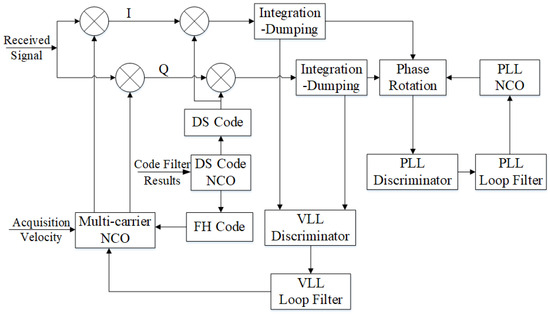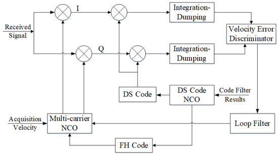 In recent decades, the tracking technology for a hybrid DS/FH spread spectrum signal has drawn the attention of scholars at home and abroad. The authors of [7] analyze the effects of multiple interferences on the range and velocity measurement performance of a hybrid DS/FH spread spectrum system, providing a reference for the research on hybrid DS/FH spread spectrum signal tracking. A carrier tracking method aided by a frequency hopping pattern is presented in [8]. The Doppler shift variable introduced by the next frequency hopping point is estimated based on the predicted frequency hopping pattern and the current speed measurement. However, the maximum hopping speed is only 1.2 khop/s. The authors of [9] propose a hybrid DS/FH spread spectrum signal tracking approach. Although the hopping rate reaches 10 khops/s, the coherent integration period only occupies one frequency hopping time slot, which is only applicable to high signal-to-noise ratio (SNR) scenarios. The key technologies for the reception of hybrid direct sequence/fast frequency hopping (DS/FFH) spread spectrum signals are investigated in [10], including signal acquisition, tracking, and group delay equalization methods, in which the signal tracking part adopts the same method as that used in [8]. Although the frequency hopping rate involved is up to 100 khops/s, the information rate is set to be the same as the frequency hopping rate, making it only applicable to scenarios with a higher SNR. The authors of [11,12] employ a tracking scheme based on a velocity locked loop (VLL), which utilizes the coherent integration results of multiple hops for discrimination. The employed scheme simultaneously achieves the requirements of a high hopping rate and low SNR, yet the involved dynamic is merely 10 g/s, where g = 9.8 m/s2. Table 1 lists the hopping rates, dynamics, SNR, and loop structures involved in [8,9,10,11,12].