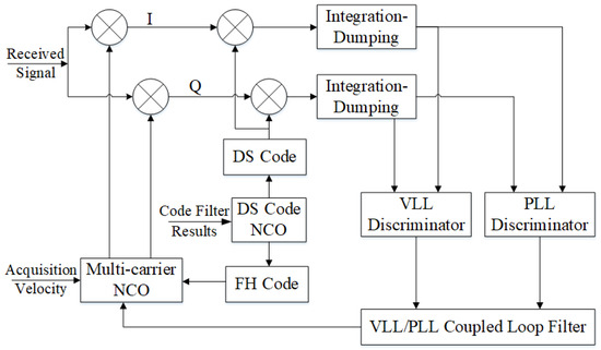 The hybrid direct sequence/frequency hopping (DS/FH) spread spectrum technology integrates the strengths of both a direct sequence spread spectrum (DSSS) and a frequency hopping spread spectrum (FHSS), making it a preferred choice for applications in space TT&C (Telemetry, Tracking, and Command), satellite communication, satellite navigation, and various other domains demanding robust anti-interference and anti-interception capabilities [1,2,3,4,5,6]. In the hybrid DS/FH spread spectrum system, multiple carriers are transmitted in a time-division pattern. Due to the continuous hopping of the carrier frequency, even if the motion speed remains constant, the carrier’s Doppler frequency will experience corresponding variations. When the relative motion speed is high, the Doppler frequency differences across different carrier frequencies become greater. The continuous hopping of the Doppler frequency introduces new frequency step excitations to the carrier tracking loop, necessitating constant adjustments to accommodate these changes. As a result, this ongoing frequency step response poses a severe challenge to steady-state tracking. Particularly in high dynamic environments, such as high-speed mobile communication scenarios, the first-order and second-order rates of change of the Doppler frequency become even more significant. These rates of change not only increase the difficulty of tracking but may also lead to the loss of lock. In response to this challenge, we need to conduct in-depth research on the tracking algorithms for hybrid DS/FH spread spectrum signals under high dynamic conditions.