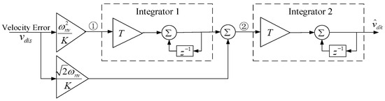 After filtering the input velocity error signal, the filtered state variables of the high-order loop filter also contain high-order information in addition to the filtered velocity error result, such as acceleration and jerk [24,25,26,27,28,29,30]. In the second-order VLL loop filter structure shown in Figure 4, signal ① located before Integrator 1 is actually the filtered second-order change rate of the velocity error (i.e., jerk), and the corresponding discrete transfer function between the input and ① is