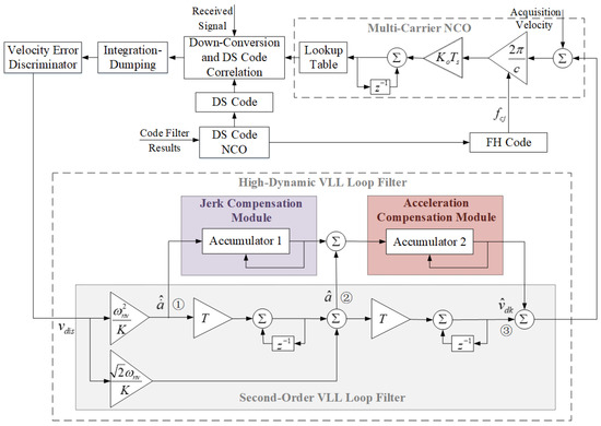 Based on our previous thorough discussions, we recognized the issue of frequency agility in hybrid DS/FH spread spectrum signals. This characteristic of frequency agility poses significant challenges to the traditional structure of an FLL-assisted PLL. However, it is noteworthy that although the carrier frequency of the hybrid DS/FH spread spectrum signal undergoes hops, the relative motion speed remains continuously variable. Consequently, we utilize the VLL instead of FLL to track hybrid DS/FH spread spectrum signals. Nevertheless, when facing high dynamic scenarios characterized by significant acceleration and jerk, the rapid variation in signals makes it difficult for a traditional VLL to effectively cope and maintain stable tracking.
