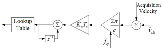To address the above problem, considering that the relative motion velocity is almost constant while the Doppler frequency is severely hopping between the two adjacent hopping time slots, we replace the FLL with a VLL in hybrid DS/FH spread spectrum signal carrier tracking. A VLL is much the same as an FLL except for the velocity discriminator. After the synchronization of the FH code, both the transmitter and receiver know the prior information of the FH sequence; thus, the velocity value can be converted to the corresponding Doppler frequency value in the multi-carrier NCO module. The structure of the VLL is shown in Figure 1.