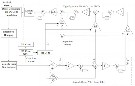 For hybrid direct sequence/frequency hopping (DS/FH) spread spectrum signals, even if the relative motion speed between the transmitter and receiver remains constant, the Doppler frequency will vary due to the continuous hopping of the carrier frequency. Under high dynamic conditions, the first-order and second-order change rates of the Doppler frequency attached to the received signal further increase the Doppler frequency agility, making it difficult for the carrier tracking loop to maintain steady-state tracking. To address these issues, a high dynamic velocity locked loop (HD-VLL) is proposed in this paper. Specifically, the accumulated phase tracking error caused by acceleration and jerk is first analyzed. Subsequently, to compensate for this phase tracking error with the system clock, the proposed loop adds an acceleration compensation module and a jerk compensation module. However, this results in the output of the high dynamic loop filter being updated with the system clock, which contradicts the multiplexing design of a traditional loop filter for parallel signal processing, making the hardware implementation of an HD-VLL impractical. Therefore, this contradiction leads us to design an HD-VLL-based multi-carrier NCO (HD-VLL-NCO). The HD-VLL and HD-VLL-NCO are simulated, revealing the HD-VLL’s superior dynamic adaptability and steady-state tracking, while the HD-VLL-NCO achieves comparable accuracy with the appropriate truncation bit width.