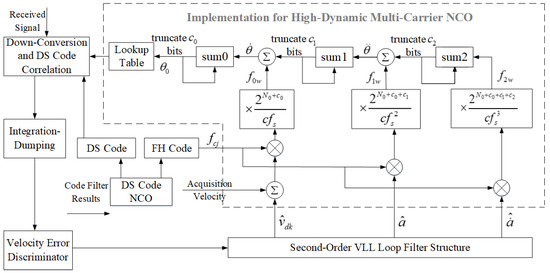 As is shown in Figure 7, the structure of the second-order VLL loop filter is displayed in the dashed box at the bottom, and the structure of the high dynamic multi-carrier NCO is displayed in the dashed box at the top.