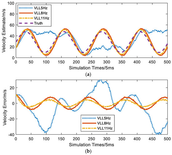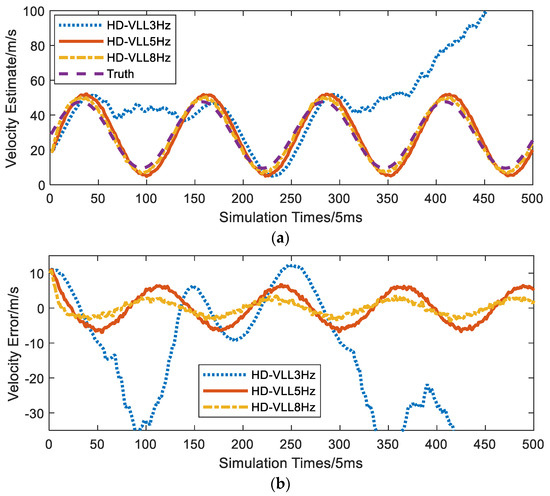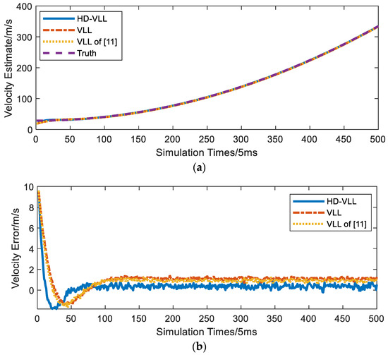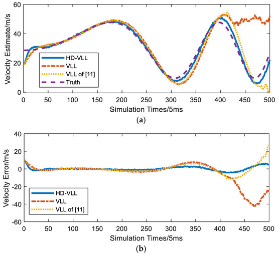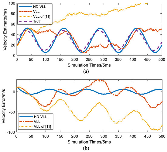 The tracking results of the VLL, the VLL in [11], and the HD-VLL with a velocity of [20sin(2t2) + 30]. (a) The velocity estimate curve. (b) The velocity error curve.