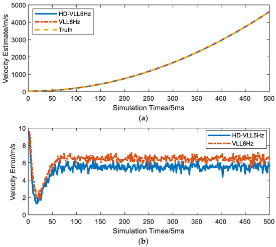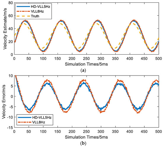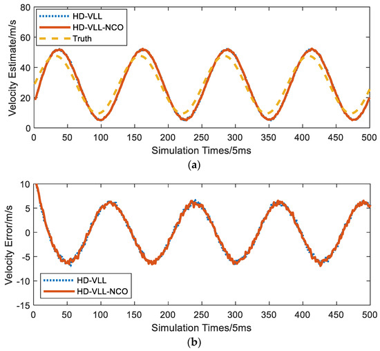 The tracking results of the HD-VLL-NCO and HD-VLL (5 Hz). (a) The velocity estimate curves. (b) The velocity error curves.