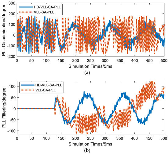 The PLL tracking results of the HD-VLL-SA-PLL and VLL-SA-PLL. (a) The PLL discrimination curves. (b) The PLL filtering curves.