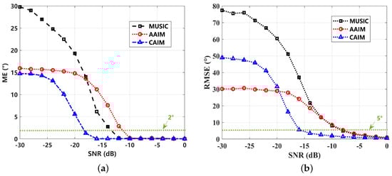 As shown in Figure 1a, CAIM can perform better than AAIM and MUSIC, especially under low SNR conditions. This indicates improved performance for CAIM with postprocessing approaches such as vector acoustic DOA histogram, particle filtering approaches, etc. The RMSE comparison in Figure 1b is in accordance with the above analysis, indicating that CAIM is superior in practical situations with SNR > dB. Nevertheless, under circumstances where SNR < dB, the RMSE of CAIM is worse than that of AAIM. In fact, all three methods see decreased performance with large estimation errors. The AAIM results tend towards as a constant, with the background noise taking a dominant position. Note that and reference lines are utilized to provide guidance for practical applications.