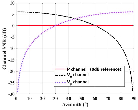 In the following analysis, the p channel is adopted for convolution preprocessing. As is known, three signal channels p, , and are measured by a UAVS. Without loss of generality, either or can be the reference channel. According to the signal model of UAVS, when the target azimuth is , the projection intensity coefficient vector of its signal part on the x and y axes is . Due to the unknown target situation in practice, its orientation has uncertainty within the range of . For a certain distance of the target, the received signal-to-noise ratio of the UAVS p channel is only related to the target distance, while the signal-to-noise ratio of the and channels fluctuates greatly with changes in target orientation. As the p channel is omnidirectional scalar, we take the SNR received by the p channel as a reference of 0 dB. Then, a theoretical comparison of the SNR changes for channels and is provided as shown in Figure 3. It is clear to see that when there is a dynamic change in the SNR received by each channel, especially when the target azimuth is close to and , the corresponding SNR of channels and is greatly decreased. This can provide guidance in the selection of reference channels, as the vector channel SNR is related to the target azimuth . Note that the results in Figure 3 are a qualitative description according to Equation (1) and Equation (2).