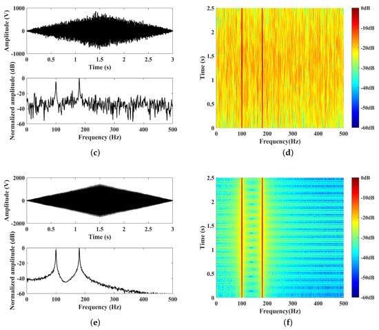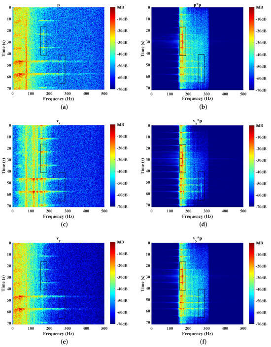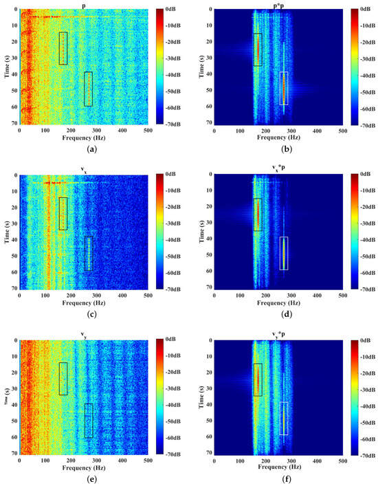 The received signals of , , and and the corresponding COV preprocessing results are provided in Figure 8, Figure 9 and Figure 10. A bandpass filter [150 Hz, 300 Hz] was utilized before COV preprocessing. The point was about 4.42 km to the UAVS, which was the nearest. The ocean background noise was varied with time, with impulsive interference in about a 10 s period. The SNR of the p channel was the best overall, allowing us to clearly distinguish the signal frequencies of 170 Hz and 270 Hz in the time–frequency domain, as shown in Figure 8.