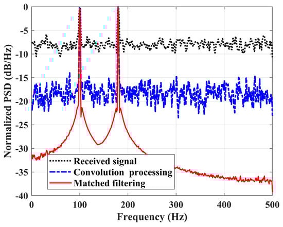 Comparison of the normalized power spectrum density (PSD) with the Welch method for the noisy received signal, convolution processed signal, and matched filtering processed signal.