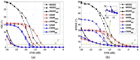 The results are shown in Figure 6, with every data point the averaged of 2000 times. It is clear that the vector acoustic estimation performance can be effectively improved by , , and . By utilizing MF preprocessing, the results of , , and are superior, which can be regarded as the upper bound of the convolution-based single vector acoustic preprocessing methods. In view of the improvement in performance, the utilization of COV preprocessing is more effective for the MUSIC and AAIM methods than for the CAIM method. This means that the proposed COV preprocessing is more effective for vector acoustic DOA estimation methods subjected to time domain signals. As shown in Figure 6a, within estimation error, the ME performance of the MUSIC, AAIM, and CAIM methods can be improved by around 3 dB, 4 dB, and 1 dB, respectively. Note that the analysis of ME performance can make sense for postprocessing methods of vector acoustic DOA such as particle filtering, histograms, etc. [27,28,29]. The RMSE performance results are shown in Figure 6b. It can be seen that within estimation error, the RMSE performance of the , , and methods can be consistently improved, which reveals the effectiveness of the proposed COV preprocessing.
