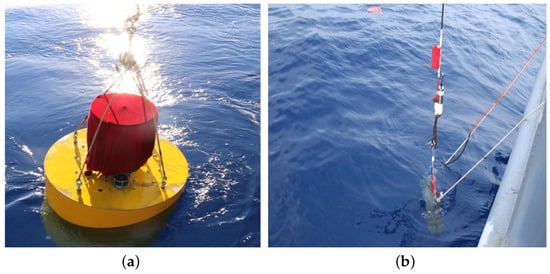 Sea experiment: (a) deep-sea buoy with a single UAVS and (b) deployment of the UW350 low-frequency broadband sound source.