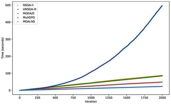 Due to MOALNS dynamically adjusting the usage probabilities of various heuristic operators through weight control during its evolution, conducting a theoretical analysis of its complexity becomes challenging. Therefore, we opt for an experimental approach to demonstrate and evaluate the complexity characteristics of MOALNS. The experiments were carried out on the P-n50-k10 dataset, from which it can be observed in Figure 1 that the complexity of MOALNS is not high. This is primarily because, when decoding a single path and calculating its cost, the complexity of other algorithms is , while MOALNS only needs to recalculate the altered nodes of the path, resulting in complexity of .