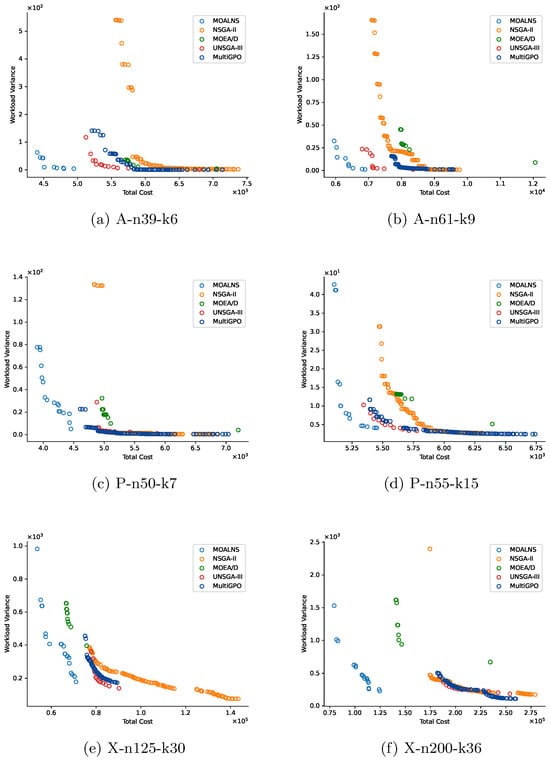 The results show that the HV indicator of MOALNS is better than that of the other algorithms across 37 instances, only performing poorly on one small-scale instance. This may be due to the fact that, when the dataset is small, all algorithms can find shorter path solutions, but MOALNS’s performance in searching for solutions under workload variations is not as effective as that of the other algorithms. Figure 2 shows the Non-dominated solution sets of the five algorithms on the test dataset. From the figure, it can be observed that MOALNS consistently demonstrates superior convergence in terms of the cost (primarily controlled by the distance) compared to the other algorithms.