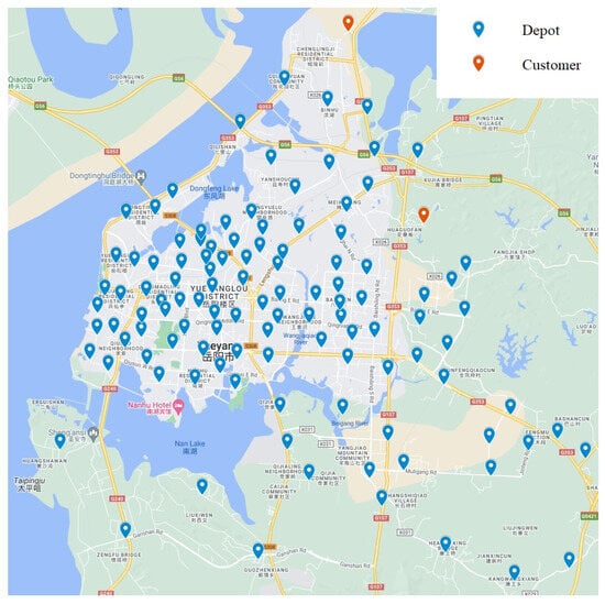 The proposed MOALNS algorithm was applied to a practical case study in a city in Hunan Province, featuring an MSW collection scenario with waste sorting. The case involved 112 primary waste collection sites and two waste processing centers, as illustrated in Figure 3. Due to the complexity of the road network and other factors, the model established in this paper considers only the primary collection points, which imposes certain limitations. In practice, waste is transported to these primary collection points from various locations through different means.