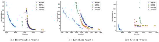To meet the waste sorting requirements, routes were calculated for recyclable waste, kitchen waste and other types of waste. All waste collection vehicles were identical. The result is shown in Table 6. MOALNS achieved the best results when compared with the other four algorithms. Moreover, it outperformed the the other algorithms in the remaining scenarios. This experiment confirms that the proposed MOALNS algorithm delivers better optimization results for this model compared to traditional metaheuristic algorithms. Moreover, it can be observed in Figure 4 that MOALNS achieved excellent results in the collection of recyclable waste and other types of waste. MOALNS demonstrated very good convergence effects, both in the total cost and workload variance. For the kitchen waste issue, MOALNS also achieved a convergence effect on the total costs that was not reached by the other algorithms. This indicates that MOALNS fully leverages the advantage of ALNS in achieving better convergence over metaheuristic algorithms in the VRP.