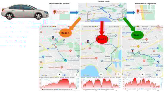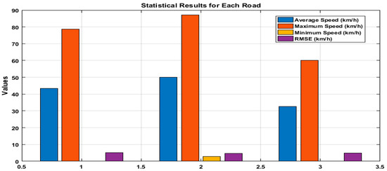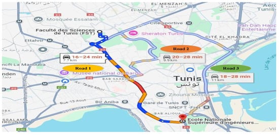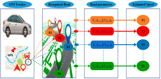 To estimate the vehicle’s speed along a given route, the process starts with Step 1 (GPS Tracking), where precise coordinates for the departure and arrival points are recorded using a GPS device. This initial data forms the foundation for route planning. In Step 2 (Road Recognition), the characteristics of the roads between these points are analyzed. This involves identifying various road features such as road type, number of lanes, and speed limits, as illustrated in Figure 2. Step 3 (Road Parameter Extraction) involves gathering critical parameters necessary for speed estimation, including the Traffic Level State (TTR), which provides insights into current traffic conditions; total travel duration; and real-time measurements of acceleration and velocity. These parameters are collected via a GPS speedometer, which continuously monitors the vehicle’s speed and acceleration. Finally, in Step 4 (Speed Estimation), the gathered data are used to calculate the estimated vehicle speed. This calculation relies on a specific formula detailed in Equation (8), which integrates the extracted road parameters to produce an accurate speed estimate. Each step is essential for ensuring precise velocity estimation, with the quality of the final result heavily dependent on the accuracy of the initial GPS data and parameter extraction.