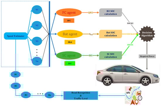 The proposed vehicle architecture features a hybrid electric system consisting of a FC, a Bat, and a SC [32]. The FC functions as the primary power source, while the SC and Bat serve as supplementary power sources. Specifically, the Bat provides power during steady-state conditions, such as when hydrogen fuel is low or during regenerative braking, while the SC is responsible for handling transient peak power demands. To improve electrical energy management and overall efficiency, a new control algorithm, the EMA, has been developed for energy distribution and decision-making. This algorithm regulates load demand by estimating the state of charge based on speed profiles derived from GPS data. The HHEV is modeled using a multi-agent framework, as illustrated in Figure 1. The model will be implemented and tested in real-time using MATLAB/Simulink.