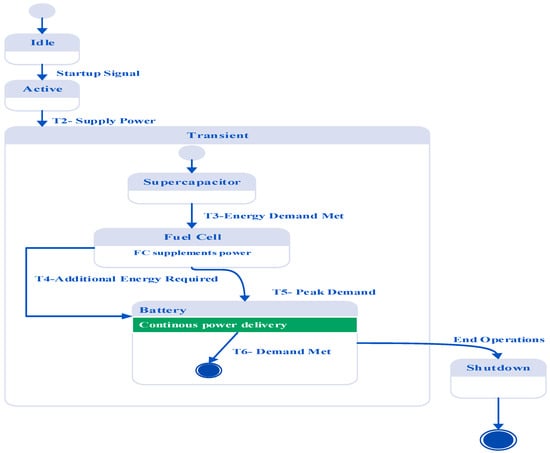 The system begins in an idle state and transitions to an active state upon receiving a startup signal, leading to a transient event where the SC is first activated to supply power to the load. Depending on energy demand, the system may then shift to the FC state, where the FC either takes over or supplements the power supply. If additional energy is required, the system transitions to the Bat state to ensure continuous power delivery. Transition times (T2, T3, T4, T5, T6) indicate the shifts between these states, determined by specific conditions and energy requirements. The system ultimately proceeds to a shutdown process, concluding in an end state when all operations are completed. This diagram illustrates the dynamic operation of the energy management system, ensuring optimal energy utilization from the SC, FC, and Bat to efficiently meet the vehicle’s power demand.