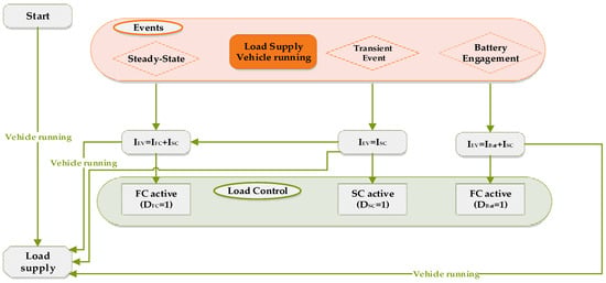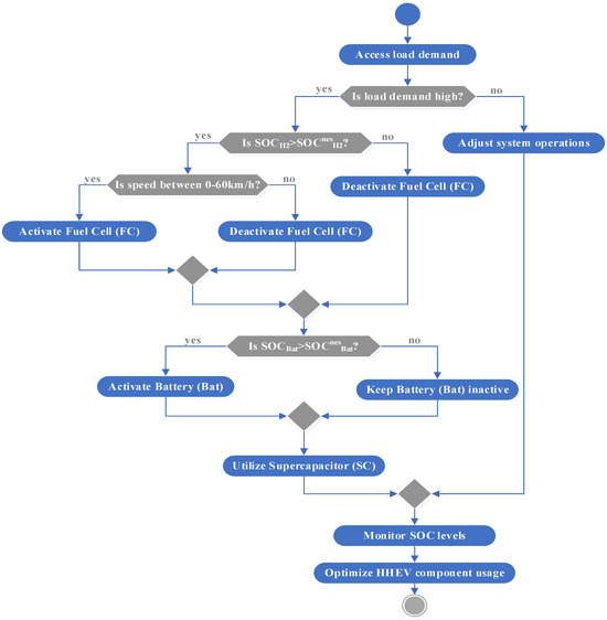 The flowchart presented in Figure 6 illustrates the energy management process for a HEV, where various power sources namely, an FC, Bat, and SC are dynamically activated based on real-time conditions to optimize energy consumption. The process begins by assessing the load demand on the vehicle; if the demand is high, the system adjusts its operations accordingly.