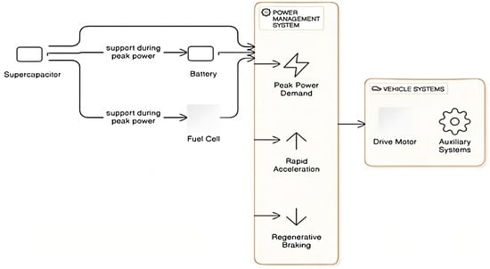 This energy source faces several technical limitations. Specifically, it has slow power transfer and a high cost per watt. Additionally, its power transfer rate is particularly slow during transient operations. As a result, FC cannot be used alone for electric traction to meet load demands [11,12]. As a result, the automotive industry is working to address these challenges by integrating storage systems with FC to meet the power requirements for traction applications. Storage systems typically serve as secondary energy sources, providing additional power during acceleration and absorbing excess power during braking [12,13]. When used alone in electric vehicles, Bat has several drawbacks, including long recharge times and poor transient response [14]. Moreover, Bat performance can be significantly impacted by high current discharges. To address these issues, we have paired the Bat with a set of SC to complement both the Bat and the FC, thus meeting the vehicle’s power needs [15,16]. Compared to FC and Bat, ultracapacitors offer lower energy density but higher power density.