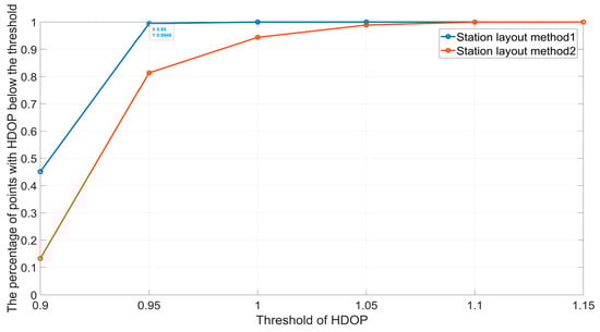 Figure 2 depicts the cumulative distribution function (CDF) of the HDOP for each deployment method. From Table 2 and Figure 2, it can be seen that the average HDOP of the first method of station layout was relatively small, at 0.904, and the HDOP of all points was lower than 1. The average HDOP of the second method of station deployment was relatively high, at 0.927, with approximately 94.39% of the points having an HDOP lower than 1.