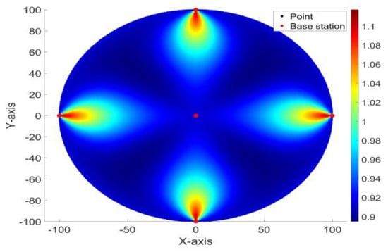 The simulation results in Figure 3 and Figure 4 show the distribution of HDOP values at various locations calculated using the HDOP formula. The overall distribution of the HDOP values can be visually observed. Different depths of colors are used in the figure to indicate the magnitude of HDOP values at different locations. The right column in the figure indicates the HDOP values corresponding to the different colors. The closer the color is to dark blue, the smaller the HDOP value is, while the closer the color is to red, the larger the HDOP value is. It can be seen that the HDOP of the first method of base station deployment was generally smaller, and the points with larger HDOP values in both deployment methods appeared to be located in the area with smaller angles and shorter distances from a certain base station, presenting a fan-shaped area with larger HDOP values.
