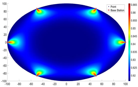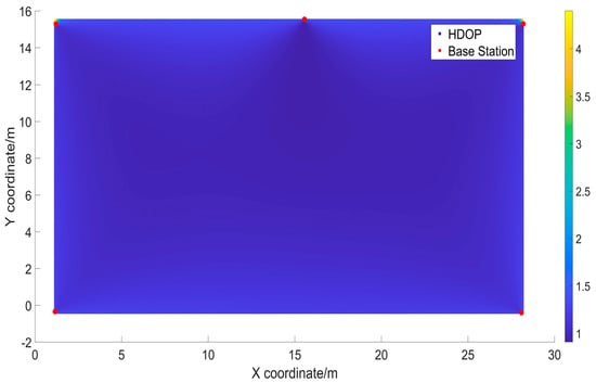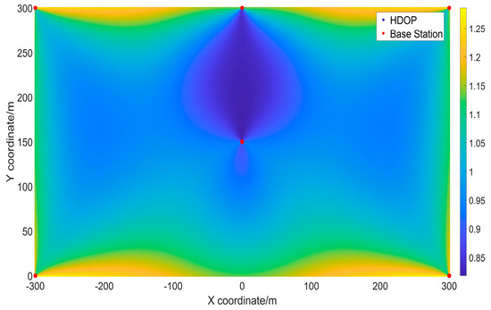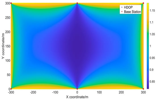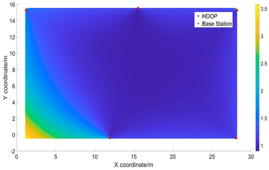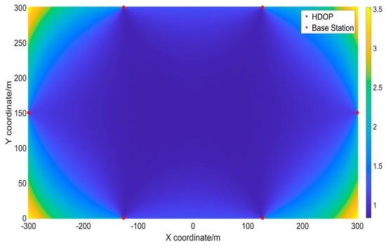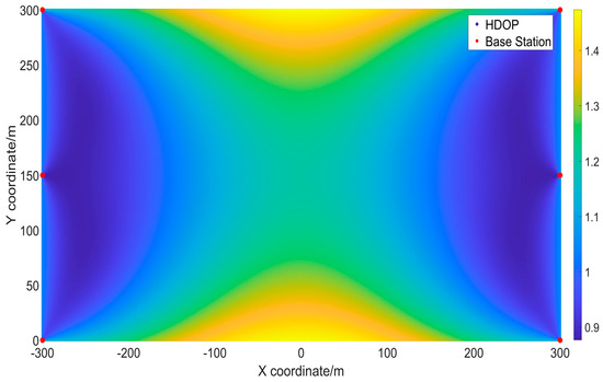 The geometric accuracy factor is one of the indicators for measuring positioning accuracy. In terms of two-dimensional positioning, the main focus is on the horizontal accuracy factor HDOP. The smaller the HDOP value, the more ideal the geometric distribution of the base station [12]. The calculation of HDOP involves the geometric distribution of the base stations, that is, the angle of and positional relationship between the base stations and the receivers. It is influenced by many factors, including the number and location of the base stations [13]. Generally speaking, when there are a large number of base stations and their positions are evenly distributed, the HDOP value will be lower [14].
