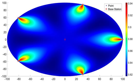 Next, we increased the number of base stations to six and analyzed the impact of base station location and number on HDOP values through simulation experiments. The two selected station deployment methods are: (1) six base stations evenly distributed around the circumference and (2) five base stations evenly distributed aroound the circumference, while another base station is placed in the middle. The other settings for the simulation experiment were the same as those used in the previous five-base simulations. The calculation results are shown in Table 3 and Figure 5, Figure 6 and Figure 7.