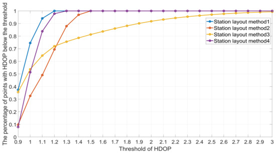In this paper, we develop simulation experiments to calculate the HDOP of each station deployment method across different scenarios. Here, we set up a circular test site with a radius of 100 m and selected several points within the circular site at a density of 50 points/m2 for the experiments. The average HDOP of these points and the probability distribution of HDOP below a certain threshold were calculated. The calculation results are shown in Table 2 and Figure 2, Figure 3 and Figure 4.
