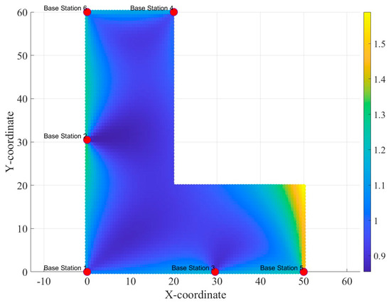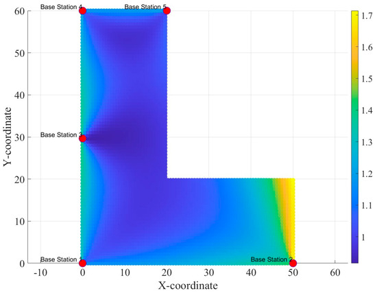 It can be seen from Figure 13 and Figure 14 that, in the ‘L’-shaped region, the average HDOP value at each point was inversely proportional to the number of base stations. The optimal station deployment strategy still prioritized vertices, with redundant base stations deployable on the edges to reduce the overall average HDOP.
