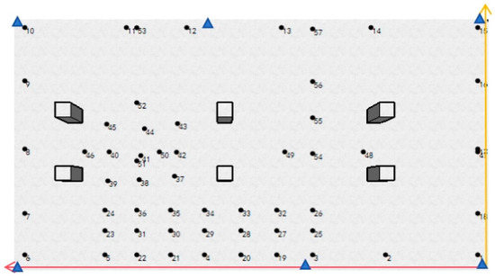 The tests were conducted in the basement of the aerospace city field area of the National Time Service Center of the Chinese Academy of Sciences. A rectangular indoor positioning scene was constructed in the basement, measuring approximately 30 m in length and 18 m in width. Six reinforced concrete pillars were installed in the middle, and six fixed UWB base stations were positioned accordingly. The testing scene and points are illustrated in Figure 15. In the figure, the yellow arrow lines represent the x-axis, the red arrow lines represent the y-axis, and the numbers denote the IDs of the testing points. The blue triangles indicate the positions of the UWB base stations, with the coordinates provided in Table 5.