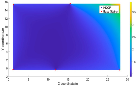 The primary task of an indoor positioning systems is to deploy base stations indoors. The deployment of base stations as part of indoor positioning systems is crucial for positioning accuracy. The position and network topology of base stations directly influence the accuracy and coverage of the positioning information [7]. Therefore, reasonably deploying indoor base stations and constructing appropriate network topologies represent the primary considerations in the context of indoor positioning. According to the analysis methods of GNSSs to attain positioning accuracy in the context of three-dimensional positioning problems, accuracy can be characterized by analyzing GDOP (geometric dilution precision), while, in the context of two-dimensional plane positioning problems, the focus is mainly on HDOP. As an indicator of positioning accuracy, HDOP can effectively evaluate the performance of the positioning system and improve its accuracy and stability by optimizing the HDOP value.