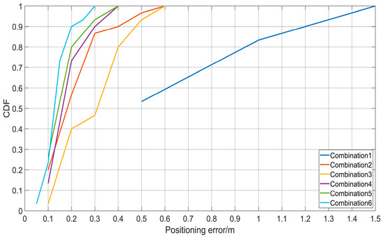 This section aims to analyze the relationship between the positioning error and HDOP through experiments. Five base stations were selected from a pool of six for each experiment, resulting in six different station layout methods and corresponding HDOP scenarios. The objective is to examine the correlation between the positioning error and HDOP for each layout method. Table 6 presents the combinations of the six layout methods.
