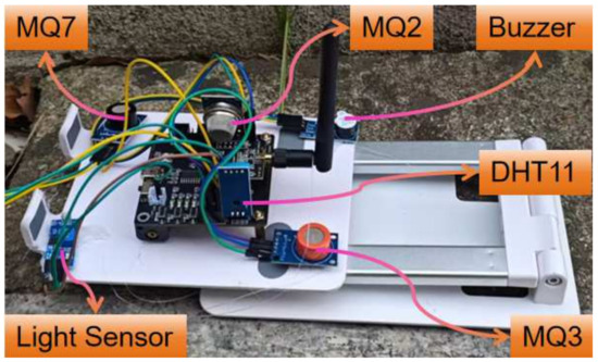 Figure 8. The coordinator node and end nodes were placed in the laboratory and playground, respectively, with a distance of about 60 m between them. For safety reasons, the experiment was conducted in an open and well-ventilated playground, as smoke bombs would have generated a large amount of particulate smoke and carbon monoxide. In the experiment, the end nodes were connected to MQ series sensors and temperature and humidity sensors. Light sensors were also used for measurements, and the entire sensor network was powered by a 3.3 V battery. In addition, in the experiment, we will randomly turn off terminal 1 or 2 to simulate its damage, and add more coordination nodes during operation. Finally, we will change the topology of this wireless sensor network many times to verify the superiority of this hybrid topology sensor network compared with the traditional sensor network.