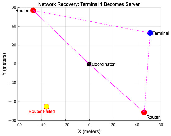 Figure 16. In this process, the hybrid topology has shown significant advantages. When the router node fails, the network can rely on its dynamic role adjustment mechanism, and other nodes can quickly take over the functions of the failed router, ensuring that the communication capability of the sensor network can be quickly restored. This mechanism not only effectively reduces the impact of single-point failures on the entire network, but also significantly improves the overall reliability and redundancy of the network.