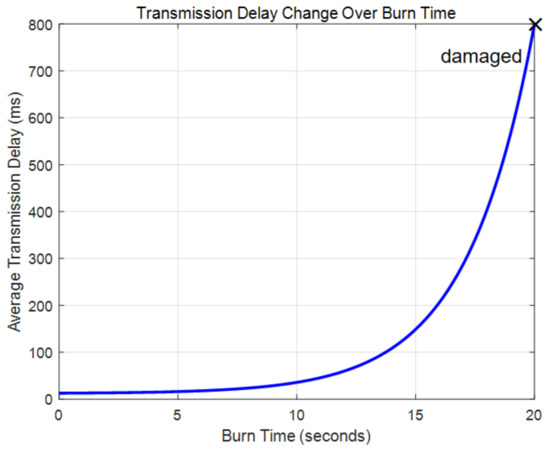 Figure 22. In addition, we added the influence of abnormal temperature to this ZigBee wireless sensor network model. We chose a temperature of 60 degrees Celsius, and the transmission delay of the sensor quickly increased to more than 500 ms. The simulation results are shown in