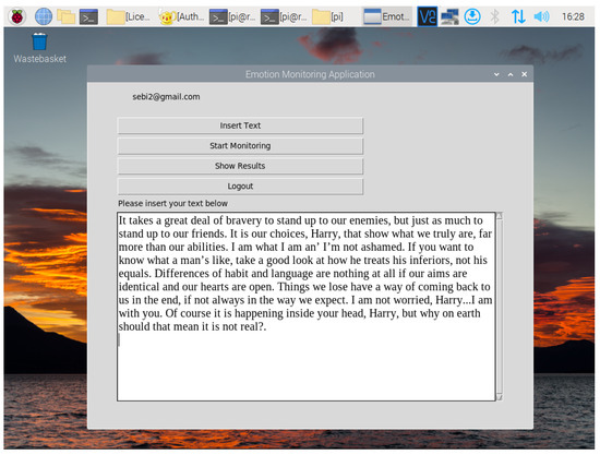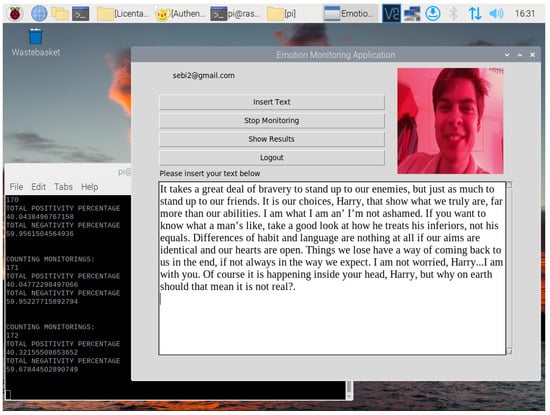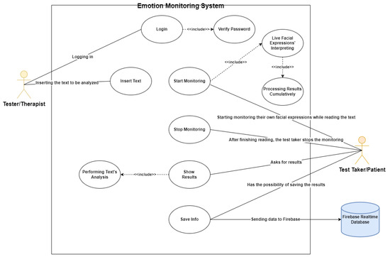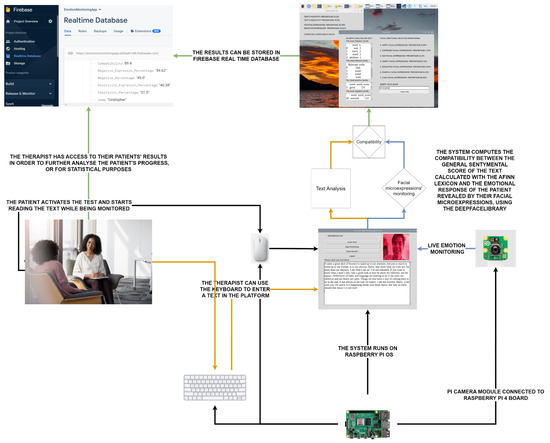 The test taker will start the monitoring by pressing the appropriate buttons on the platform and will also start reading the text. Once activated, the camera will monitor the facial expressions of the test taker in real time. At the end of the test, the test taker will press the ‘Show Results’ button to open two new windows, one containing the in-depth analysis of the text on the left and the in-depth analysis of the emotional response on the right, and the other containing the general conclusions of the computed test and the compatibility between the sentiments revealed using the Afinn list and the emotions revealed using the DeepFace system, 0.0.80 version. Finally, all conclusive information can be sent to the Firebase real-time database together with the test taker’s name under the examiner’s account. The system is built on the concept of connectivity between different analysis models, centered on user needs and comparing their separate results to gather new types of statistical data.