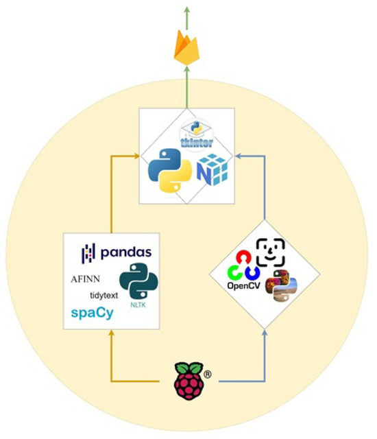 Diagram of technologies used showing (a) technologies used for sentiment analysis (left); (b) technologies used for facial emotion recognition (right); (c) technologies used for the system’s interface (top of circle); (d) Firebase Realtime Database (top, outside the circle), and (e) Raspberry Pi board (bottom).