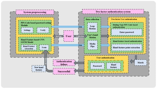 In the pre-processing phase, the PIN-based dialing module allows the user to set and confirm the password and authenticate the password entered by the user. At the same time, the hand features module based on the CNN-LSTM model extracts key hand features of users and uses deep learning technology to train these data to generate AN accurate authentication model.