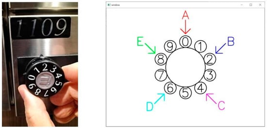 For example, when the user tries to use the PIN code “0862”, he/she must enter it in the pre-registered order at the five-entry points A, B, C, D and E. If the order is “D → E → C → A”, then the user needs to turn the dial to the position corresponding to the one shown in Table 1.