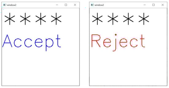On the feedback screen, the entered PIN code is displayed as “*”. After entering four digits, the result is displayed on the feedback screen. If the registered PIN matches the entered PIN, then “Accept” is displayed in blue. If there is no match, then “Reject” is displayed in red. Figure 6 shows the feedback screen when the entered four-digit PIN matches the registered PIN.