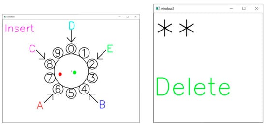 As shown in Figure 7, when deleting, the word “Delete” is displayed in green letters on the feedback screen, and the number of “*” is reduced by one. When deleting, the position of A to E on the aerial virtual dial is randomly changed. A green dot appears on the aerial virtual dial screen at the tip of the ring finger for less than one second. As with the blue dot, the user cannot delete it again until the green dot disappears.