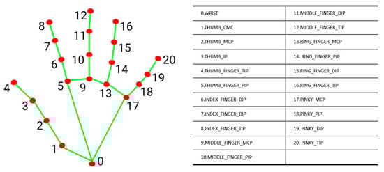 - Harris, M.; Agoes, A.S. Applying hand gesture recognition for user guide application using Media Pipe. In Proceedings of the 2nd International Seminar of Science and Applied Technology (ISSAT 2021), Yogyakarta, Indonesia, 2 February 2021; Volume 1, pp. 101–108. [Google Scholar]