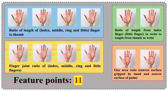 Based on the invitation of 10 experimenters to have their hands scanned 30 times (each scan generates 30 frames of data) we collected the target authentication video data, where each frame contains 11 hand feature values (finger joint ratio, finger ratio, and convex hull ratio in the center of the palm). As shown in Figure 12, The 11 feature points are index finger and thumb; middle finger and thumb; ring finger and thumb; little finger and thumb length ratio (four); knuckle ratio of index finger; knuckle ratio of middle finger; knuckle ratio of ring finger; knuckle ratio of little finger (four); ratio of the length of the index finger to the wrist to the length of the thumb to the wrist; ratio of the length of the little finger to the wrist to the length of the thumb to the wrist (two); one area ratio (convex surface of the hand and convex surface of the palm).