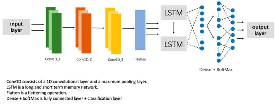 Garcia et al. compared several machine learning algorithms, including long short-term memory (LSTM) networks, convolutional neural networks (CNNs), and long short-term memory convolutional neural networks (CNN-LSTMs) [23], which adjust hyperparameters. The results show that the correct classification rate of the CNN-LSTM is 84.76%, which is slightly higher than the other networks.